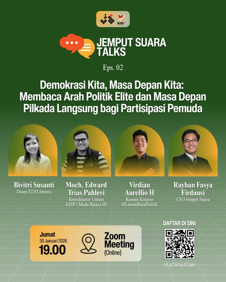 Bersama Bivitri Susanti (Dosen STHI Jentera), Moch. Edward Trias Pahlevi (Koordinator Umum KISP/Muda Bicara ID), dan Virdian Aurellio (#LawanButaPolitik), kita akan bedah isu ini secara kritis, jernih, dan berpihak pada demokrasi yang inklusif.